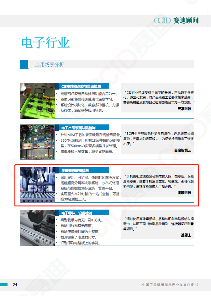 全球机器视觉技术的崛起,很大程度得益于消费类电子行业的发展。根据白皮书,机器视觉被广泛应用于电子及半导体、汽车制造、食品包装、制药等领域,而在所有应用场景中,电子行业的应用占比将近一半。机器视觉装备的应用能够帮助电子行业企业提高生产柔性和智能化程度。以手机领域应用为例。